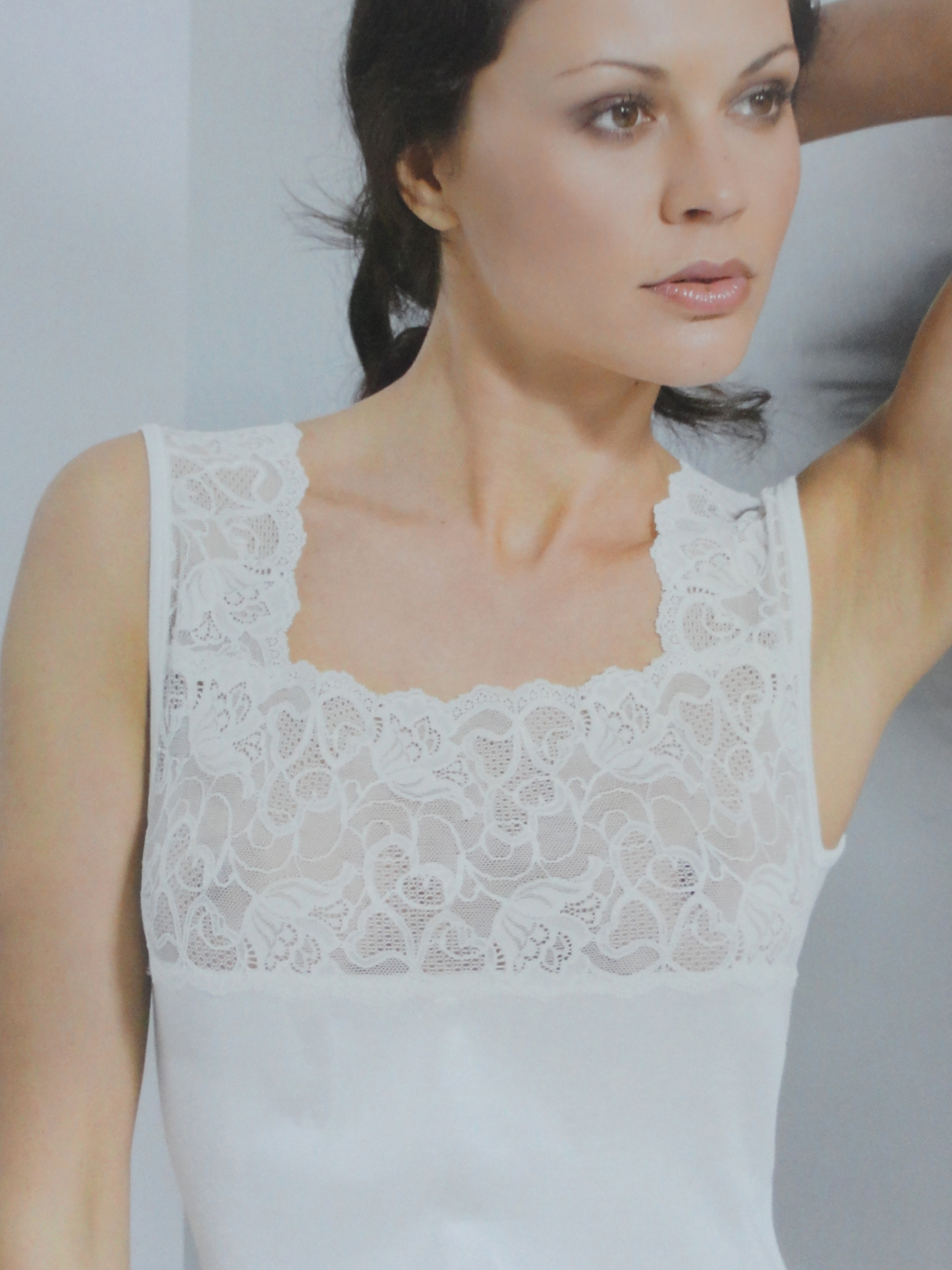 Canottiera da donna a spalla larga, liscia, con ampia fascia in pizzo.