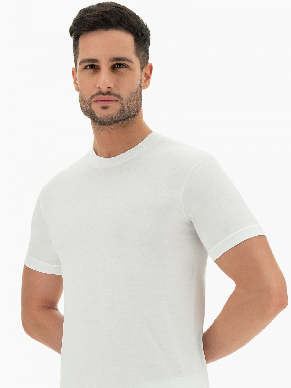 T-Shirt mezza manica realizzato in puro cotone pettinato con esclusiva tecnologia di tessitura antiavvitamento che garantisce indeformabilità al lavaggio, senza cuciture sui fianchi, collo con parasudore. Trattamento con azione antibatterica.