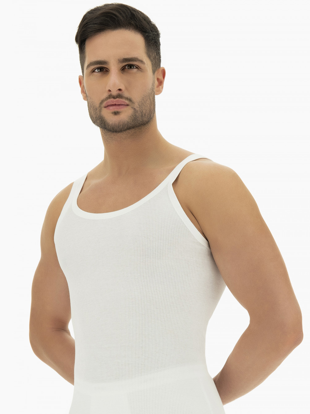 Vogatore spallina stretta a costine, in puro cotone pettinato, senza cuciture sui fianchi, naturale, morbido ed assorbente. La tessitura a coste conferisce al capo una naturale elasticità, per il massimo comfort e vestibilità. Trattamento con azione antibatterica.