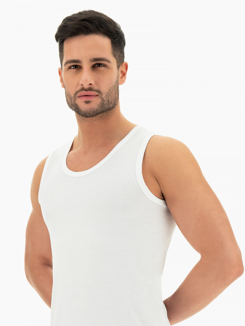 Vogatore a spalla larga, in puro cotone pettinato, senza cuciture sui fianchi, naturale, morbido, leggero ed assorbente.